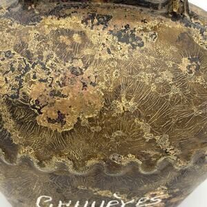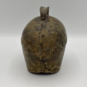 The Ghuyeres Vintage Swiss Cowbell is a medium-sized decorative collectible bell with a loud tone and traditional style. Handmade in Switzerland, this brass cowbell features an abstract ribbon pattern and a clapper for a unique sound. With a beautiful brass and brown metal scheme, this cowbell is perfect for all occasions and adds a touch of vintage charm to any collection. The Ghuyeres brand ensures quality craftsmanship and authenticity, making this cowbell a valuable addition to any farm, dairy, cowboy, or bell collection. Bell measures approximately 4.5” tall and wide and weighs about 12 ounces. Please view all photos.