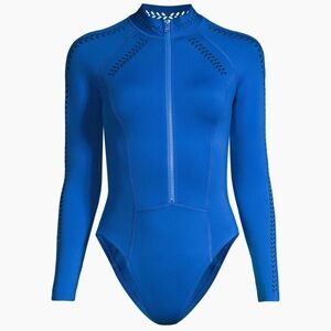 Stylish blue one piece with long sleeves. Features unique cutout design. Ideal for beach or pool.