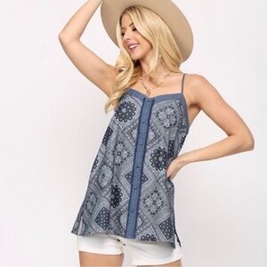 GiGiO USA Pattern Print Chambray Cotton Covered Button Tank.