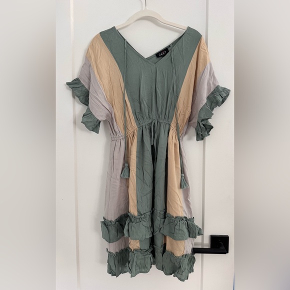 Stylish colorblock dress with ruffle details. Features a mix of green, beige, and gray tones