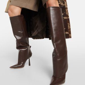 Chic dark brown leather boots. Features a pointed toe and sleek silhouette. Ideal for fashionable events.