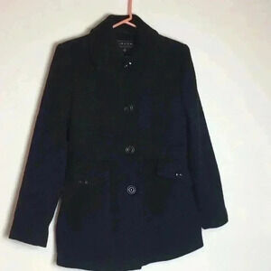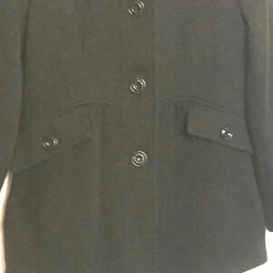 Good used condition no stains warm coat and stylish. Small hole in the back of coat see photos and too button is loose can be sown.