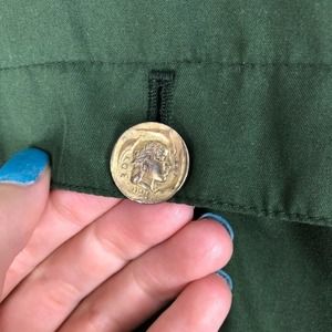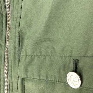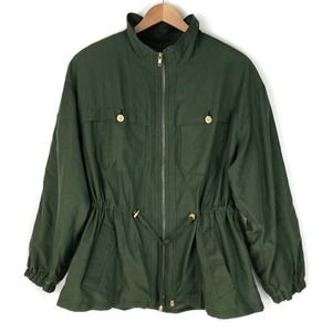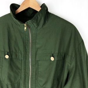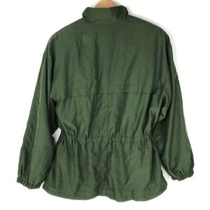 A lightweight windbreaker by vintage label Giacca Sport. Army green color. Long sleeves with elastic cuffs. Full length zipper. Mock neck. Two breast flap pockets, with buttons that look like ancient coins. Drawstring at waist with embellished toggles. Hip length.