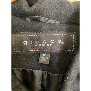 This Giacca Women's coat combines style and functionality with a warm wool blend material, a practical hood, and a full zip closure. The sleek black design ensures versatility with a variety of outfits. Labeled as size 1X for a comfortable fit, this coat also includes front flap pockets for added convenience.