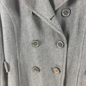 Giacca winter jacket double breasted wool blend pea coat in dark heather grey with large outer pockets and adorable button details. Super warm. Fully lined. In excellent pre owned condition. Beautiful classic fit that shows off a natural waistline.