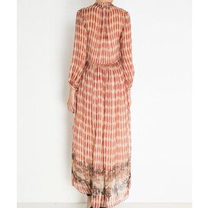 This printed chiffon silk dress floats with a light, gauzy elegance, its sheer fabric giving it an airy, dreamlike quality. The painterly print layers soft, organic tones that feel both artful and refined. Billowed 3/4 sleeves and a fluid silhouette lend movement, while the tie neckline adds a delicate, feminine finish. Designed to drape effortlessly, it’s the kind of piece that can shift from daytime ease to evening polish with understated grace.