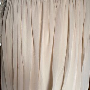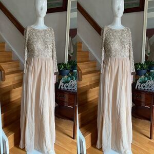 Featuring an airy chiffon skirt, a sequined tulle bodice, and three-quarter sleeves, this champagne dress is a fresh take on a timeless, elegant silhouette.