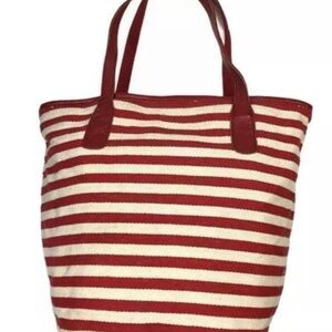 Beautiful sturdy striped tote with lining larger size New in packaging red /ivory 17” x 10” x 9”
