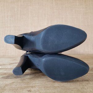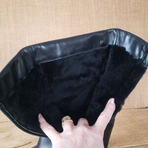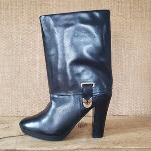 Rare Find! Beautiful authentic designer boots that simply scream "Look at Me!". Extremely soft, supple high quality black leather mid calf high heel boots lined with cozy and warm black shearling wool. Slight platform boot with side zip. Gold buckle detail. Rubber sole. Very stylish and very solidly crafted shoes.
