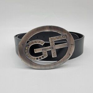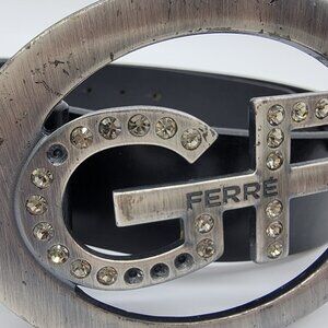 Gianfranco Ferre Belt GF Logo Belt Italy Silver Buckle Black Faux Leather Flaw