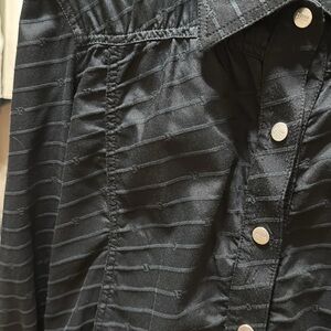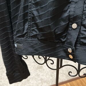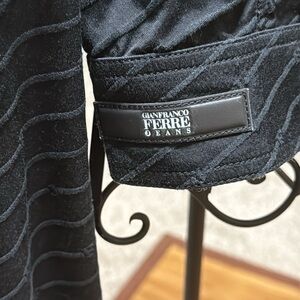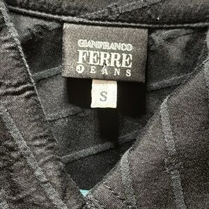 This Gianfranco Ferre jean jacket in classic black offers a timeless and versatile style. Crafted with attention to detail, it features a sleek silhouette and ribbed cuffs for a refined look. Perfect for elevating any outfit with its sophisticated charm.