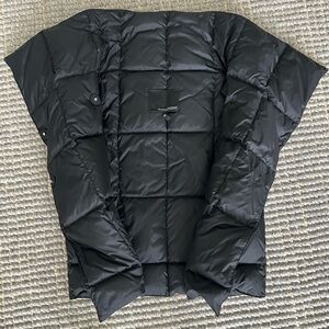 Stylish black puffer vest. Features a wide collar and button closure. Perfect for layering.