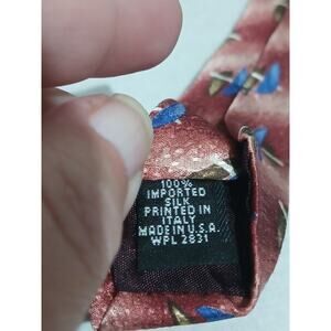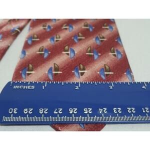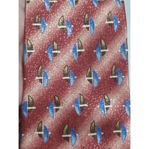 Fun print tie from gianfranco Ruffini Italy. Made from 100% imported silk this tie was printed in Italy but made in the USA. It measures about 58 in long and is about 3 and 3/4 in wide. It features a pattern of the closest I can tell is beach umbrellas in blue and brown on a diagonally striped background in shades of red with some highlighting. Please see photos for details I can't describe it any better.