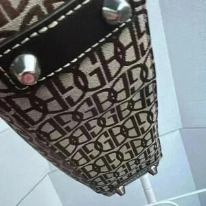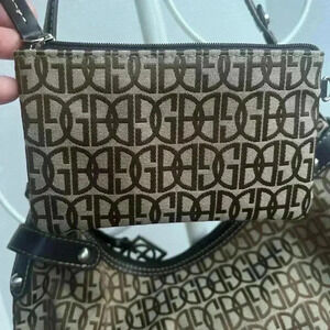 Giani betnini fabric bag w/ leather trim, 13"x4"x8", footed bottom, 20" handle w/ 10" drop, 1 main compartment w/ 2 slip in pockets & sm zip pocket, another sm zip pocket on outside too. nice leather details on nice bag in pertect condition.