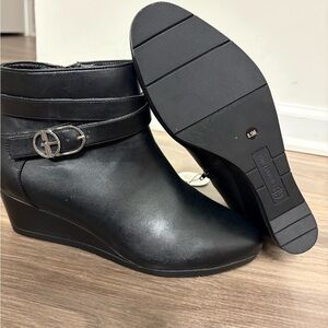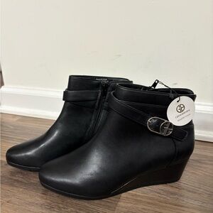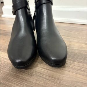 Elegant black ankle booties by Giani Bernini. Features sleek buckle accent. Perfect for any occasion.