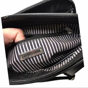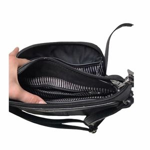 Great condition with minor flaw shown on back you can see in last picture close up in price reflects! Bundle for great discounts and I ship same day! Super cute black cross body bag with adjustable strap zip outer pockets in multiple pockets inside with a stripe lining