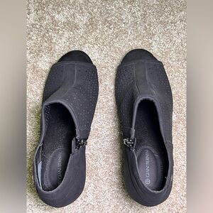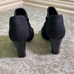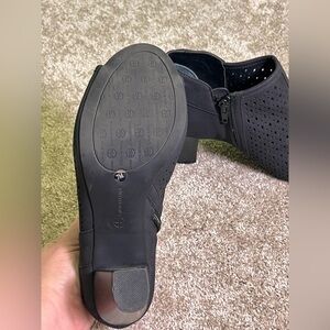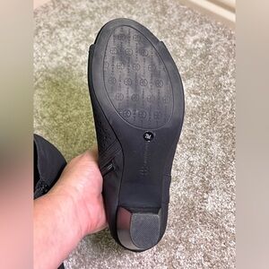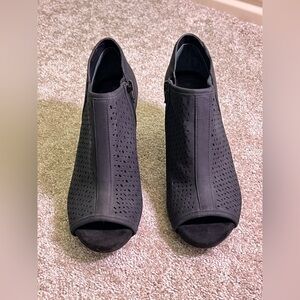 Chic black heeled boots with peep-toe design. Stylish perforated pattern. Ideal for versatile wear.