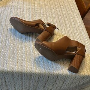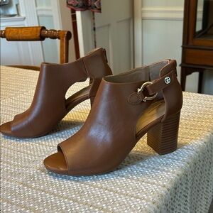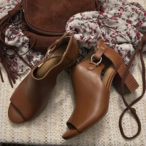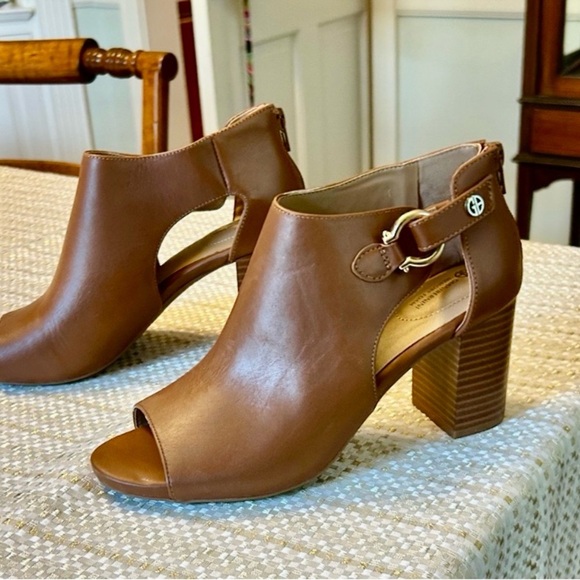 Giani Bernini Brown Peep-Toe Gold Buckle Horse Bit Block Heel Shooties size 8.5