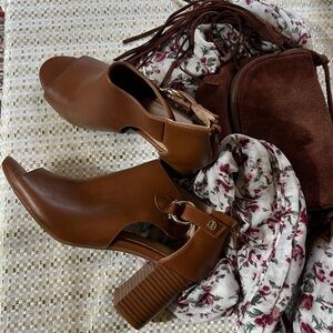 Step out in style with these chic brown peep-toe block heel boho shooties. Horse bit gold buckle style. Brown + Gold