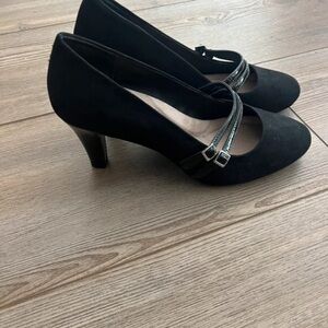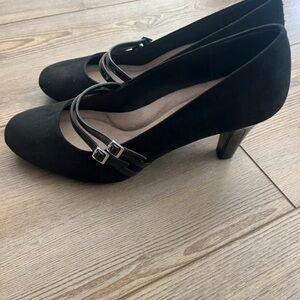 Sophisticated black heels with sleek double straps. Ideal for versatile styling.
