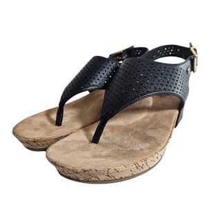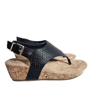 Condition: NWB - Fatima Black Perforated Thong Slingback Buckle Wedge Sandals