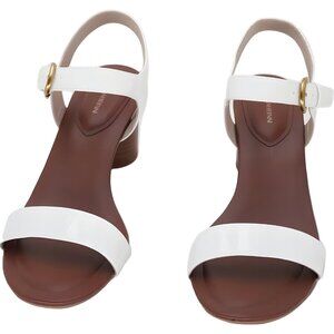 Chic block-heel sandals elevate outfits with crisp white croc texture and clean lines.