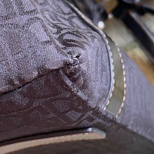 This is a Giani Bernini textile/canvas/fabric shoulder bag with faux leather straps & trim, and silver hardware, notably the GB logo dangling on the front. The color is black, with a Jacquard logo pattern. All-in-all, there are 8 separate compartment/pockets/pouches on this bag, described below. The interior is very clean with no flaws or holes. The bottom corners of the exterior do show a little wear, shown in last 3 photos. The bag is difficult to lay flat, so the measurements provided are not exact, but close! The front buckles do function, but they're strictly decorative and don't expand or contract the bag.