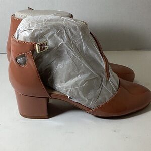 • Round-toe two-piece pumps with adjustable buckle closure at ankle-strap