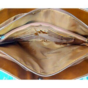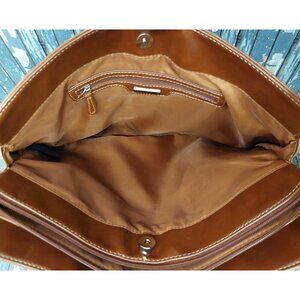 Measures 15" X 10" With 3 Interior Compartments 2 Snap Close With One having 2 Pouches and one a Zipper Pocket. The center Compartment Zips Closed and Has 3 Compartments of it's own with card holders zip pouch and ID Holder and Pen Holders. So easy to be organized with this bag! I can see it as a briefcase, laptop bag, or large tote purse! Interior is like new and the exterior is in excellent condition as well.