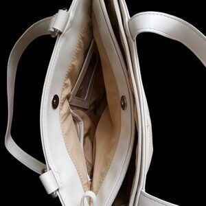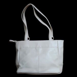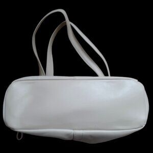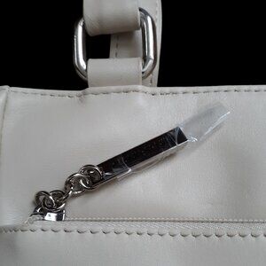 (New Without Tags,) Giani Bernini, leather with silver accents and silky tan liner shoulder bag in very nice condition without holes or stains. Bag shows a very light faint crease mark on bottom bag-pictured.