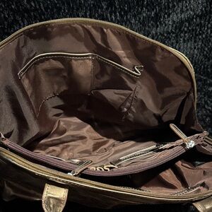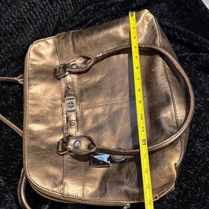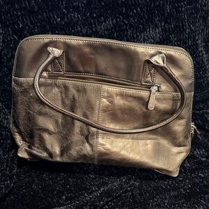 Stylish metallic shoulder bag with elegant handles. Perfect for any occasion.