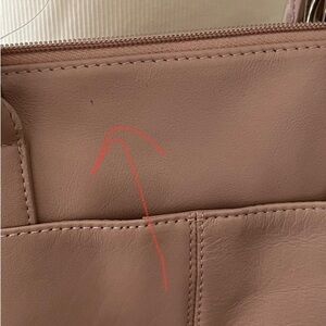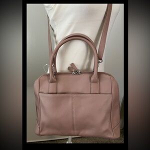 Beautiful dusty rose color has versatile,adjustable shoulder strap and handles. Zip closures on front, snap closure on back pockets interior has center zip pocket section other pockets are zip and open pocket. Silver tone hardware. Has a couple of specks as seen in close up and a flaw in side of strap. Price reflects. msrp 129 leather and non leather components
