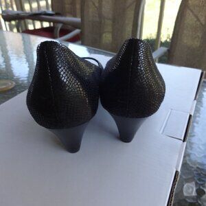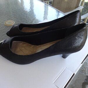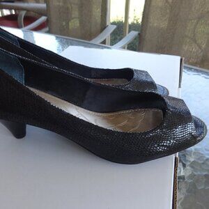 Giani Bernini Soria open toe black pumps size 8.5 medium, mini snake skin print, padded insoles, 2" heels