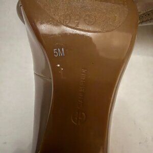 These Giani Bernini Women's Size 5 Taupe Patent Leather Slip-On Pumps have a classic almond toe shape and a comfortable mid heel height of 3 inches. Perfect for various occasions such as workwear, parties, weddings, and formal events, these pumps have a solid color and are made of faux and patent leather. The slip-on style and block heel design make them easy to wear and provide stability. Perfect for year-round wear, these pumps add a touch of elegance to any outfit.