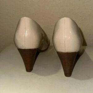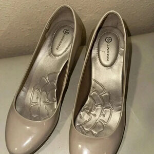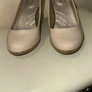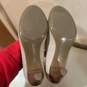 Preowned. Cushion insoles. Notice scratch on inside of left shoe. 2 1/2” heel. Faux leather. please examine photos carefully best description of shoes being sold. These are like new condition.