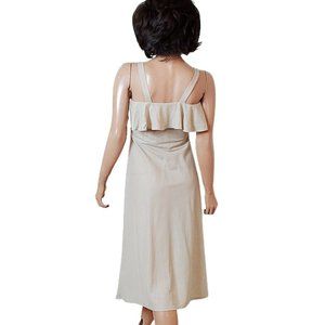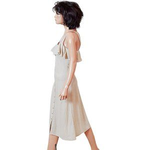 Just in time for spring and summer! Giani Bini sand colored, light 'n airy midi-dress. Features shoulder straps, ruffle top, and full front button entry. Fabric: Rayon/Nylon blend. Unlined. Machine wasable. Imported. Meas.: length (bodice top to hem) 36", bust 32", waist 28", hip 38".