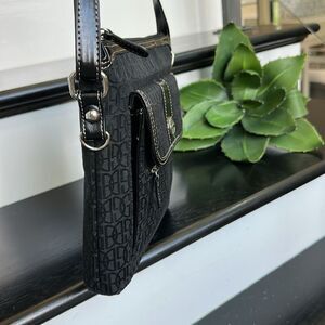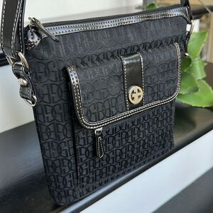 This like new Giani Bernini crossbody shoulder purse combines everyday practicality with timeless style. Crafted from durable black monogram canvas with matching faux leather trim and contrast stitching, it features a structured silhouette perfect for daily use. The front flap pocket with magnetic closure and signature Giani Bernini logo hardware adds a polished touch, while a zippered compartment underneath offers secure storage. Additional organization includes a rear zip pocket, interior compartments, and credit card slots. Adjustable shoulder strap for a comfortable fit as a crossbody or shoulder bag. Clean inside and out, from a no smoking home.