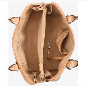 This stylish handbag features a sophisticated blue and tan design, perfect for any occasion. Its elegant look and practical size make it a must-have accessory.