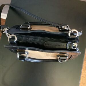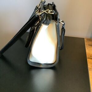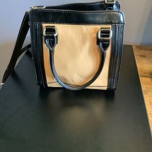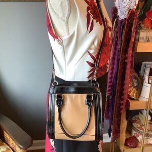 Gorgeous toffee colored and black leather crossbody with adjustable/removable strap. Purse features roomy interior pocket with one zippered and one open interior pocket. Zips to close. Classic colors. Measures 9” wide by 9” tall and 5 inches deep. Shoulder strap drop is 19” in picture.