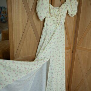Like New - Stunning pale yellow ditsy pink floral dress, size XS, zipper back, very lightweight!