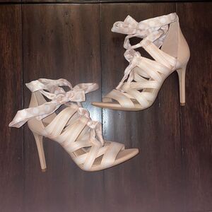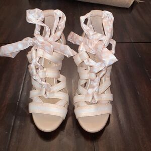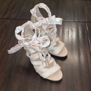 New Gianni Bini Abrianna Pink Lace-Up Sandal Heels - Pink polka dot ribbon