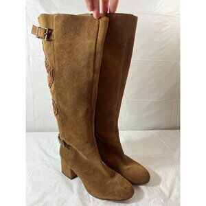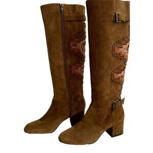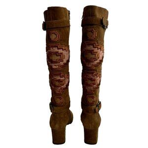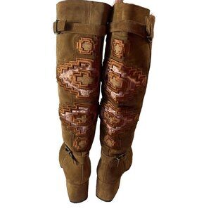 Gianni Bini Aztec Boots Knee High Embroidered Brown Leather Suede Buckle Zip 8M
