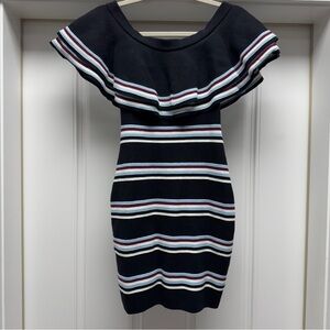 Gianni Bini Black, Blue, White, Burgundy Striped Ruffle Off the Shoulder Dress