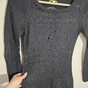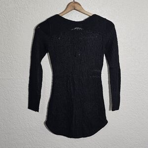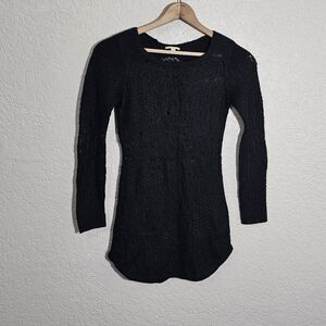 Pre-owned Gianni Bini sweater, size extra small. It's made of an acrylic/nylon/wool/mohair blend fabric that's lightweight and stretchy, has a distressed loose knit style, and it comes in solid black.