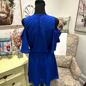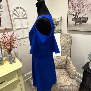 This casual sundress by Gianni Bini features a vibrant blue hue with striking orange embellishments. The cold shoulder design is complemented by flutter sleeves, while the smocked detailing adds a touch of elegance. Perfect for a relaxed day out, this midi dress combines style and comfort effortlessly.