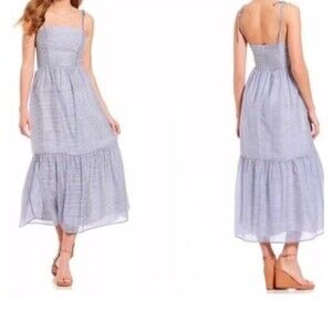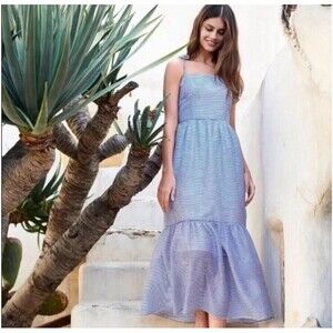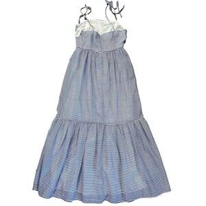 Elevate your summer style with this stunning Gianni Bini maxi sundress. The dress features blue and white stripes with a ruffle accent, adding a touch of fun and color to your beach or resort look. The dress is designed with shoulder ties and a sleeveless style, making it perfect for the warm summer sun. The dress is a size 4 and has never been worn, with tags still attached. The dress is perfect for any summer occasion and will make you feel confident and stylish. Don't miss out on this amazing opportunity to add a touch of fashion to your wardrobe.