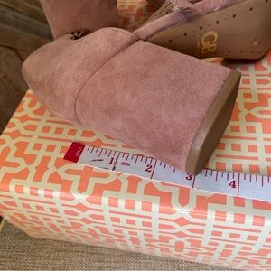 Chic blush suede heels with a stylish block design. Features a secure ankle strap for added elegance.