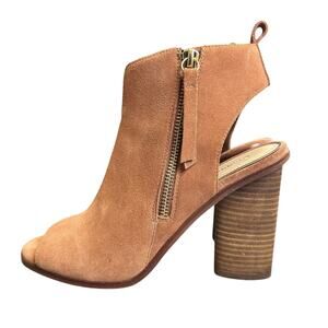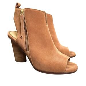 Lovely suede boots in a tan color with an open toe design and gold tone side zipper closure.