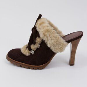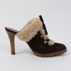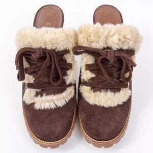 Gianni Bini Brown Suede Rugged Sole Slip-on Heels with Furry Cuffs - Size 6