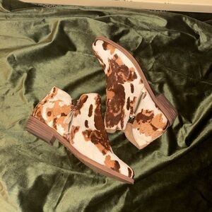 Stylish cow print design. Side zipper closure. Comfortable low heel.